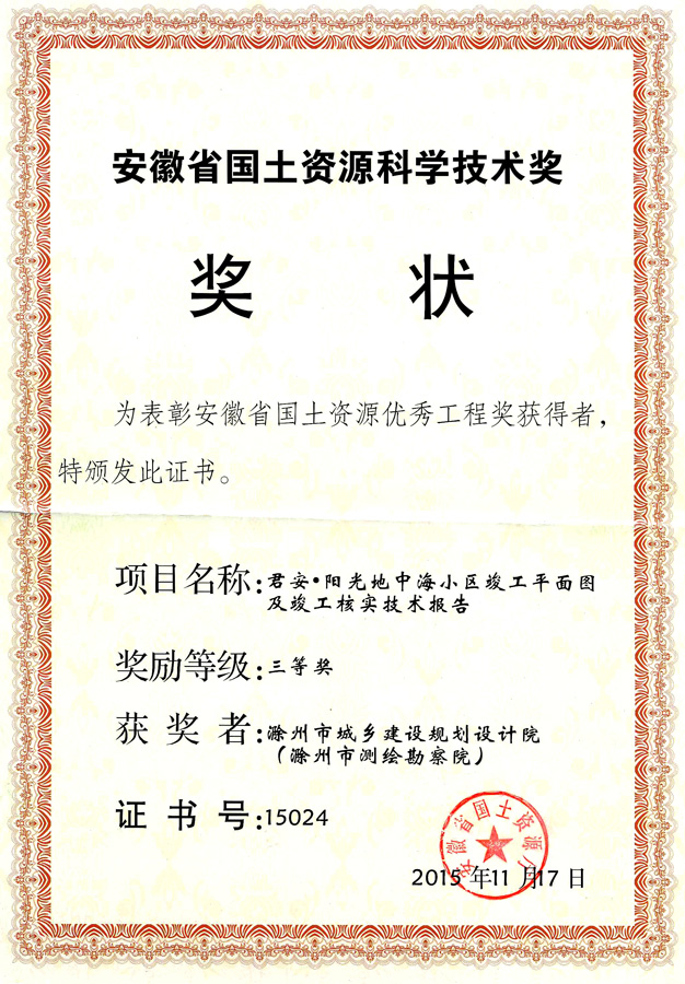 滁州市經(jīng)開區(qū)地形圖測繪規(guī)劃獲獎(jiǎng)證書